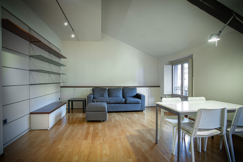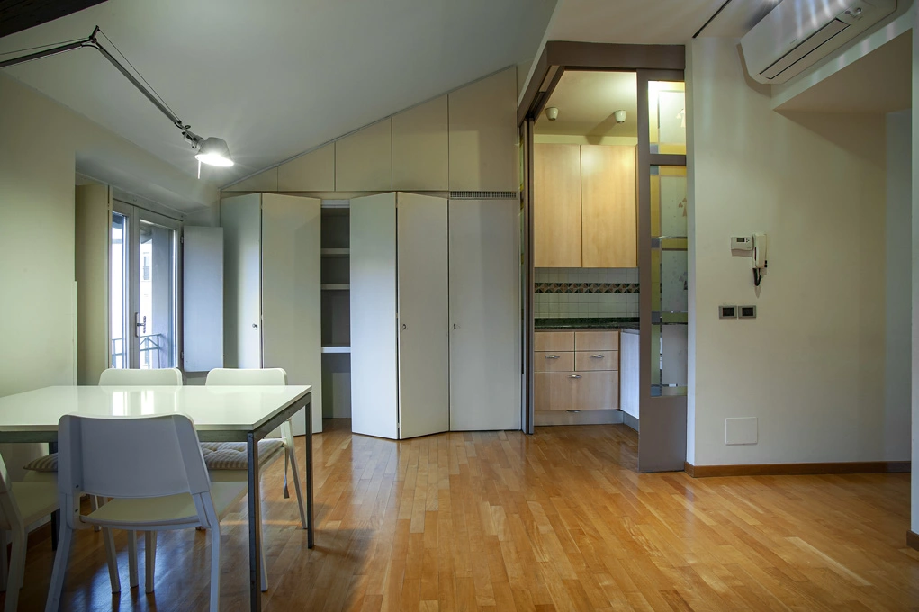 Nella esclusiva Via Mario Giuriati si vende un appartamento al terzo ultimo piano di una piccola palazzina di inizio ‘900 di sole 5 abitazioni, collegata alla strada da un cortiletto con cancellata e portoncino in ferro battuto. La casa è biesposta, luminosa, al terzo piano mansardato, ristrutturata su un progetto che dà respiro allo spazio e lo organizza ottimizzandolo con arredi e contenitori su misura disegnati sfruttando ogni parete disponibile. L’appartamento ha il parquet su tutto il pavimento, impianti in perfetto ordine, riscaldamento autonomo e aria condizionata. Lo spazio è articolato con cura: un ingresso divide la zona giorno dalla zona notte. Nella zona giorno si trova un grande luminoso soggiorno con affaccio sul verde dei giardini interni, un angolo cottura efficiente, separato da due grandi vetrate colorate scorrevoli con il sapore di una serra novecentesca, pareti attrezzate con librerie componibili e pratiche armadiature. Nella zona notte un comodo bagno con doccia e vasca e una camera da letto con armadi su misura. La casa curatissima nei dettagli, in ottime condizioni, ha i pregi di un ambiente raccolto ma arioso e funzionale, situato in una delle strade più belle della zona XXII Marzo, una zona semicentrale, ben collegata e di grande sviluppo.